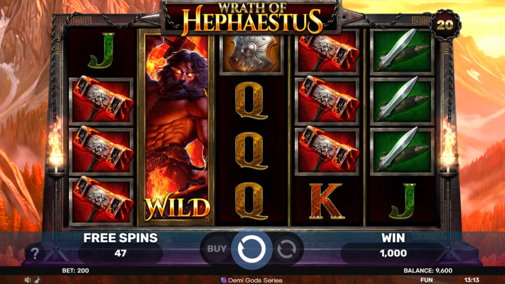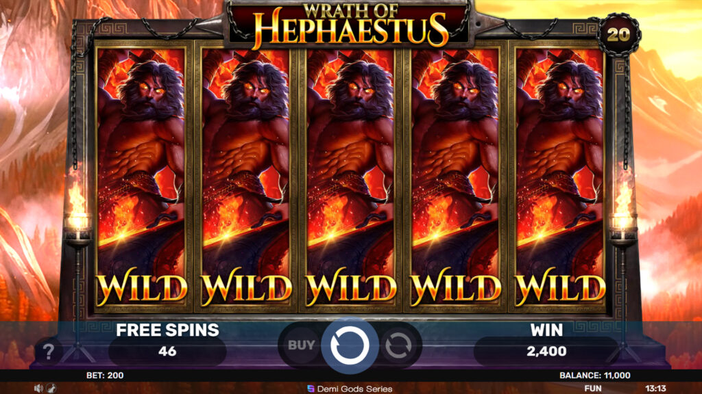 “Fire and fury rise from the forge as the god of flame unleashes his power. With every spin, molten energy surges through the reels, shaping rewards forged in heat and strength. In the god’s forge: Expanding Wilds that grow with unstoppable force Extra Wilds that fuel relentless winning potential Re-Spin Expanding Wilds that keep the fire burning Free Spins infused with divine wrath and intensity A Buy Feature for those ready to face the forge head-on Stand firm, embrace the blaze, and feel the heat of divine power in Wrath Of Hephaestus.”
